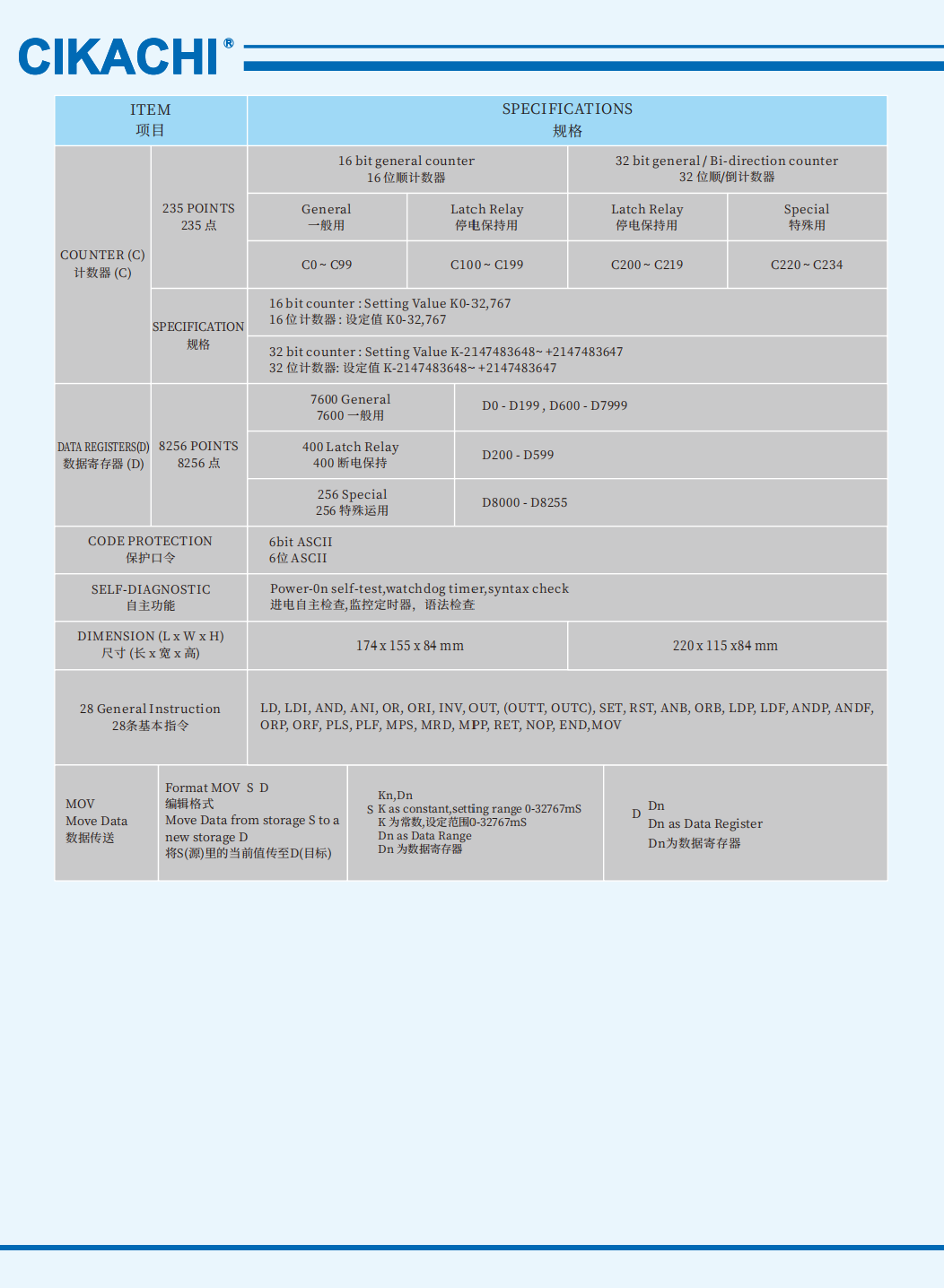 I/O Points : 48 points ( Input : 4 AD Channel + 24 Input ) ; ( Output : 20 points )